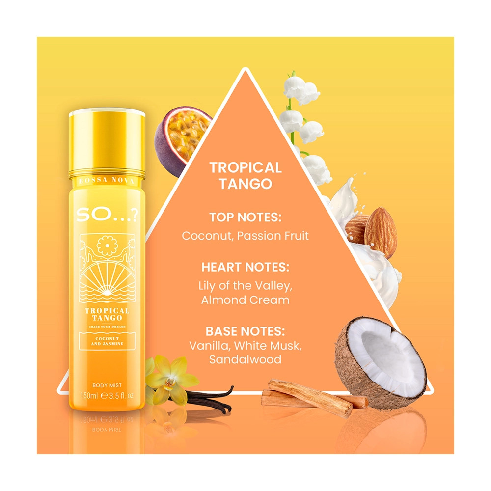 Engedd, hogy a SO…? Bossa Nova – Tropical Tango testpermet egy pillanat alatt elrepítsen egy napsütötte, trópusi hangulatba. Ez a könnyed Body Mist a brazil életérzés szabadságát idézi meg, frissítő és nőies illatkompozícióval, amely tökéletes választás a mindennapokra.